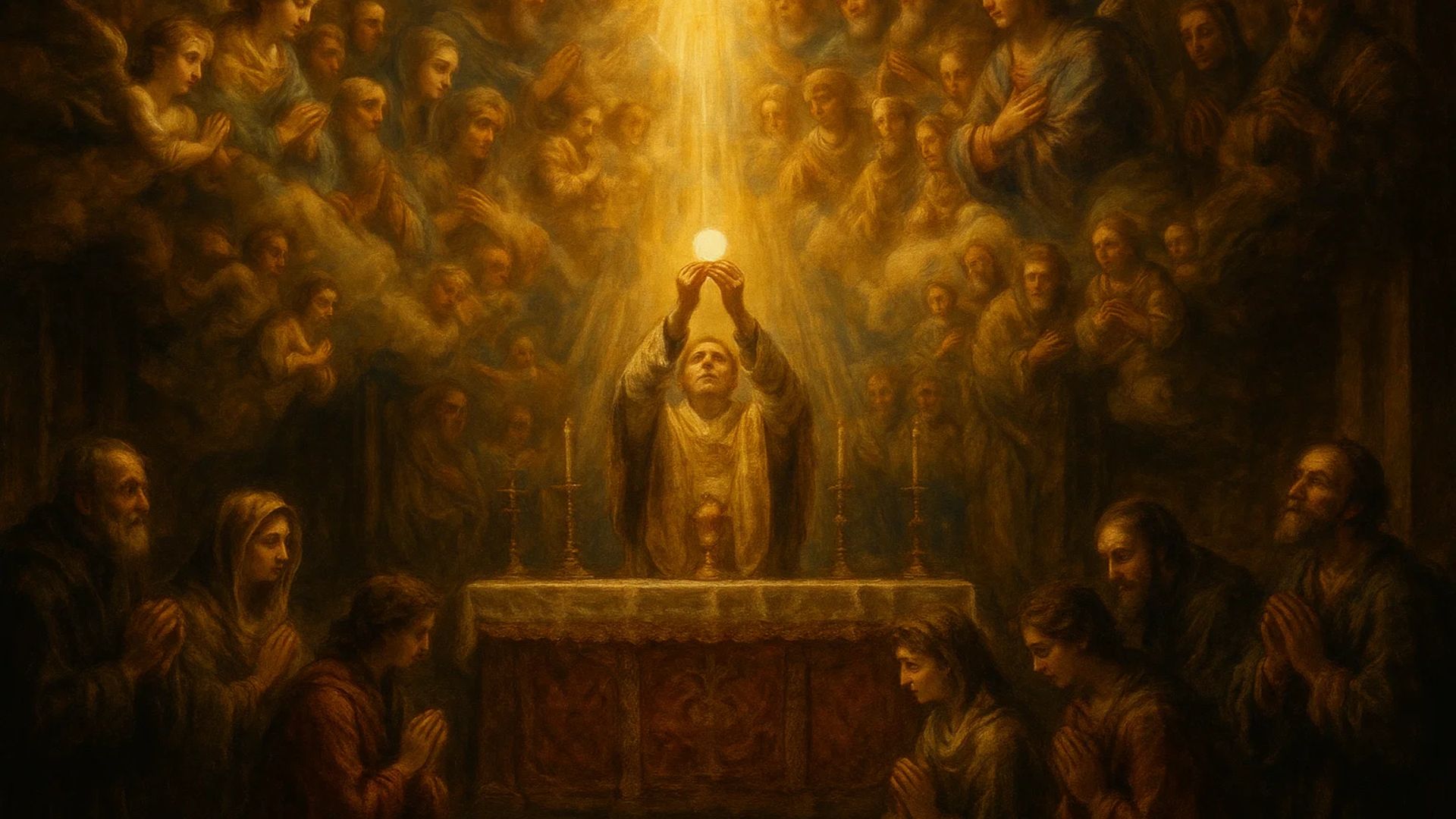 Isso significa que, cada vez que participamos da Missa, não estamos apenas num rito terreno, mas unidos aos santos e aos anjos em adoração ao Cordeiro. A Igreja visível e a Igreja celeste celebram juntas, num só louvor.